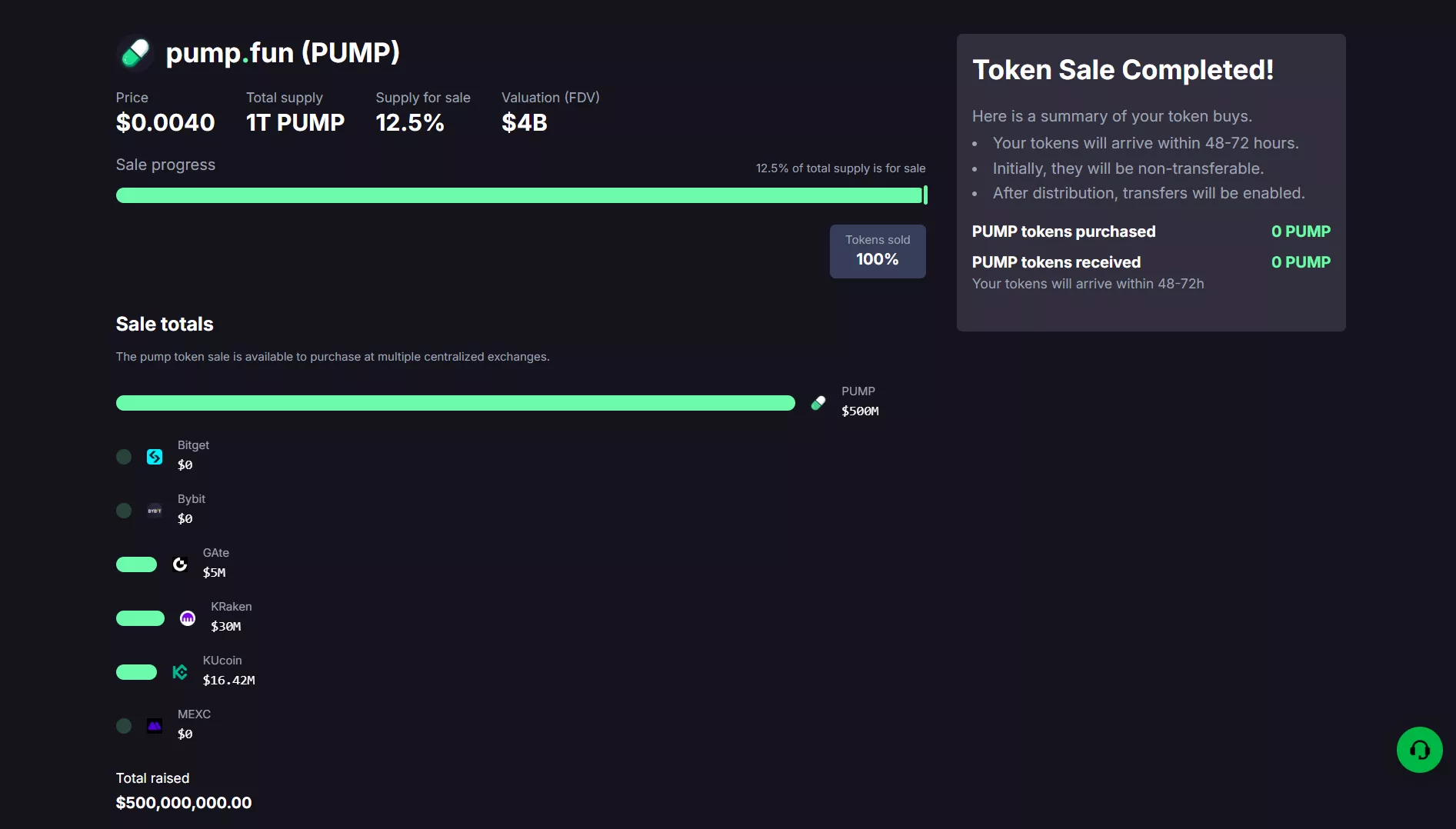 En un movimiento que ha dejado perpleja a la comunidad cripto global, Pump.fun logró recaudar aproximadamente 500 millones de dólares en apenas 12 minutos durante su venta pública de tokens. La operación, que involucró la emisión de 125.000 millones de tokens a un precio unitario de 0,004 dólares, catapultó al proyecto a una valoración totalmente diluida de 4.000 millones de dólares. Con esta hazaña, la plataforma basada en Solana reafirma su papel como uno de los actores más disruptivos del ecosistema Web3.
